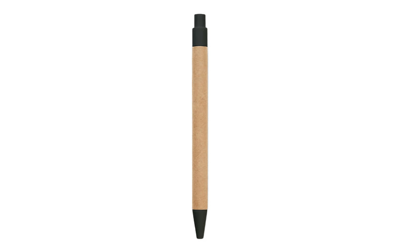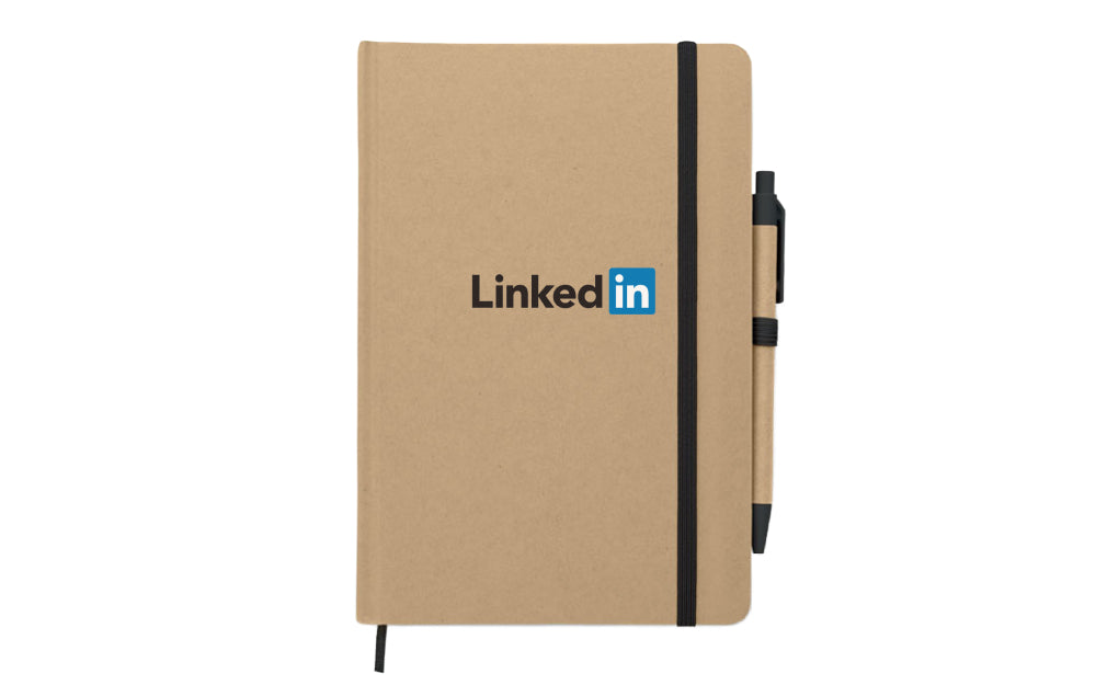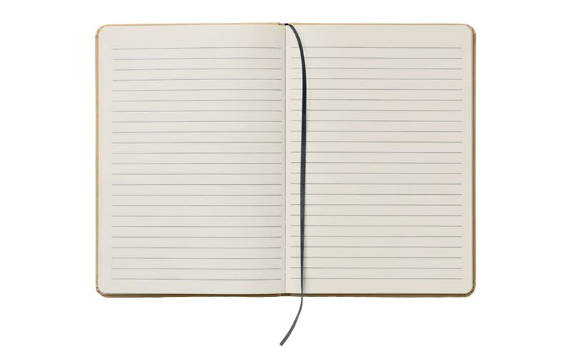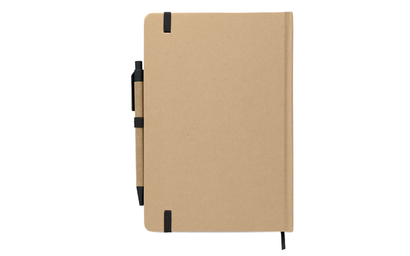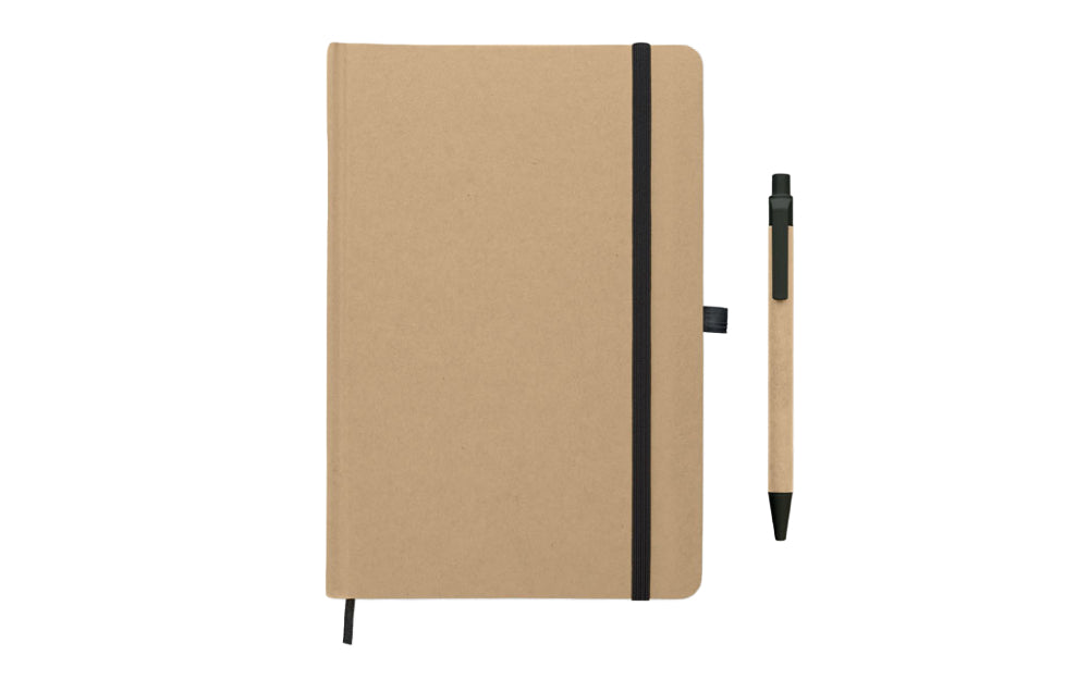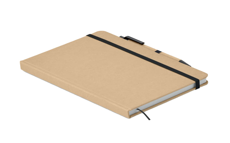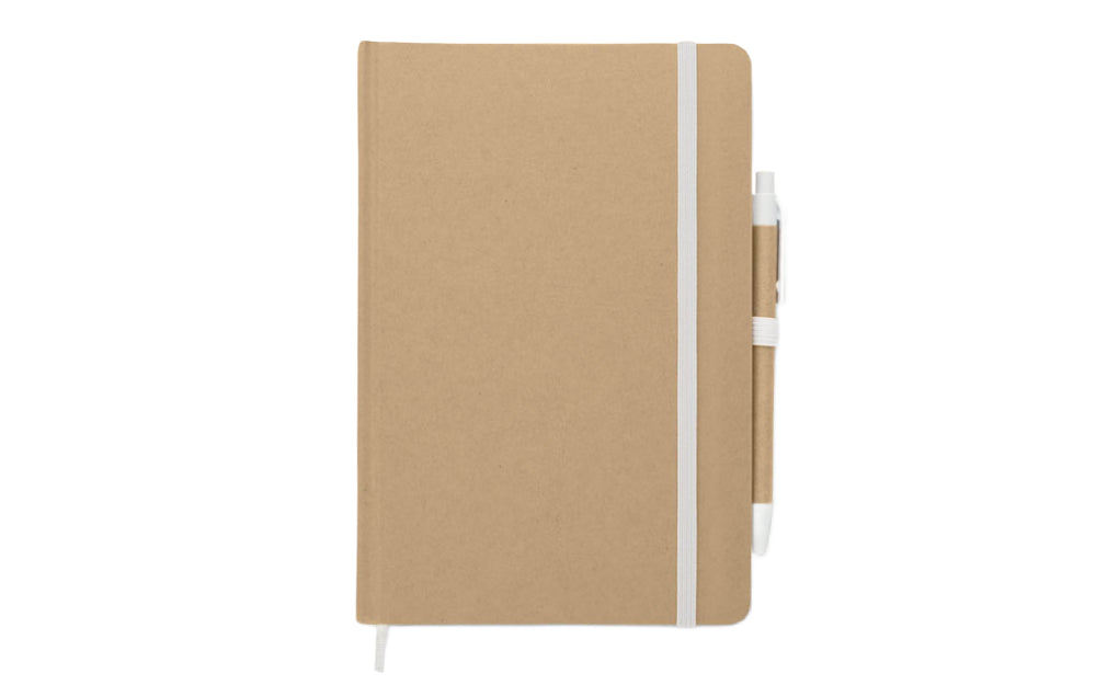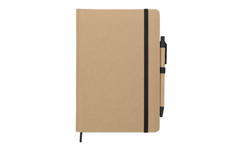 Stay organized and eco-friendly. This A5 notebook has a sturdy recycled cardboard cover, 160 lined pages, an elastic closure, pen holder, and bookmark. Includes a push-button pen with recycled paper barrel and blue ink, ready to capture every idea.