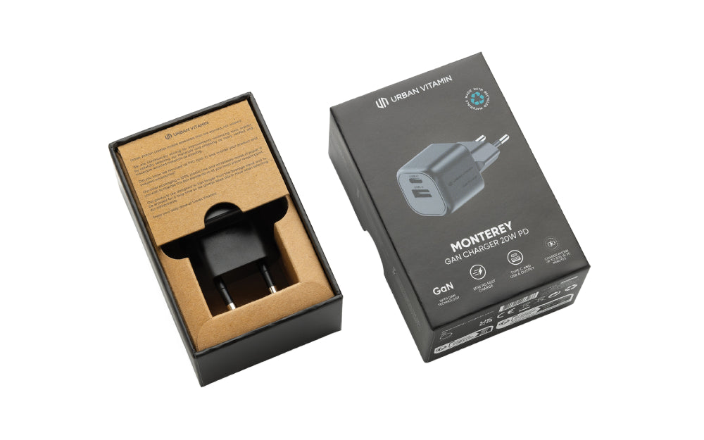 Small charger, big impact. The Monterey packs 20W of fast-charging punch into a palm-sized recycled plastic block. Stick it in your bag and stay topped up—perfect for phones, earbuds, or last-minute power boosts.
