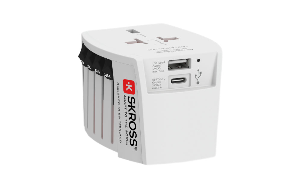 Travel light, charge smart. This Skross adapter keeps your gear powered up across continents, with USB-A built in for extra convenience. Power up, anywhere.