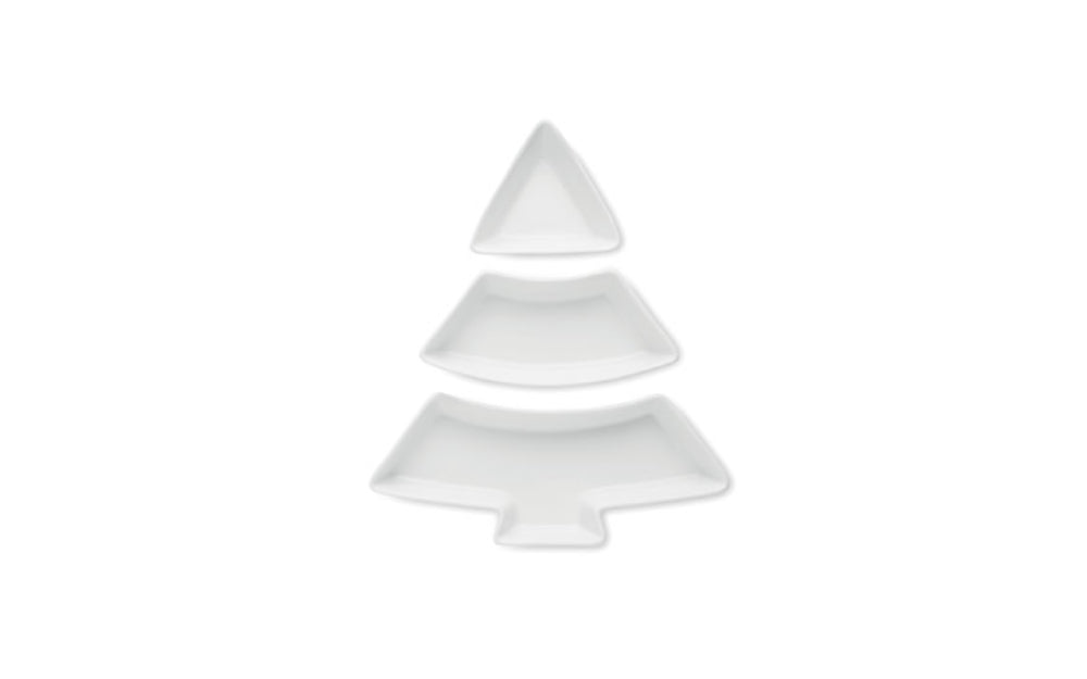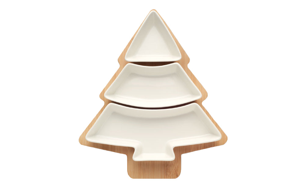 Snack in style. This bamboo platter with ceramic dishes is shaped like a Christmas tree—perfect for festive treats and party spreads.